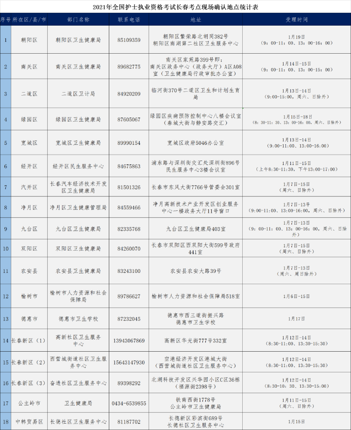 2021年護(hù)士執(zhí)業(yè)資格考試網(wǎng)上預(yù)報(bào)名時(shí)間為1月6日—21日,考試中心與各縣(市)區(qū)有關(guān)部門(mén)充分溝通,將長(zhǎng)春考點(diǎn)各行政區(qū)現(xiàn)場(chǎng)確認(rèn)信息在此公布,請(qǐng)考生完成網(wǎng)上報(bào)名后,按單位或檔案所在地衛(wèi)健局指定時(shí)間和地點(diǎn)完成初審、確認(rèn)及繳費(fèi)工作,如有現(xiàn)場(chǎng)確認(rèn)相關(guān)疑問(wèn),請(qǐng)根據(jù)下表查找所在區(qū)咨詢電話。