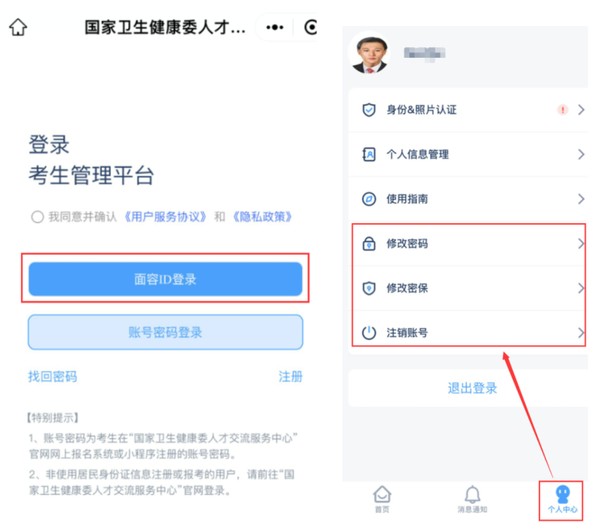 二、通過百度、微信、支付寶小程序端搜索國家衛(wèi)生健康委人才交流服務(wù)中心,進入后可通過面容識別登錄小程序,在“個人中心”可修改密碼找回問題、密碼或注銷賬戶:
