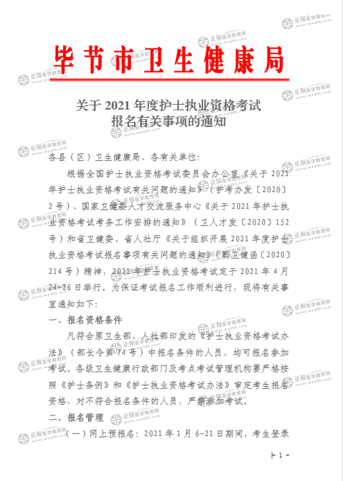畢節(jié)市衛(wèi)生健康局關(guān)于2021年度護士執(zhí)業(yè)資格考試報名有關(guān)事項的通知發(fā)布了,醫(yī)學教育網(wǎng)整理具體內(nèi)容如下: