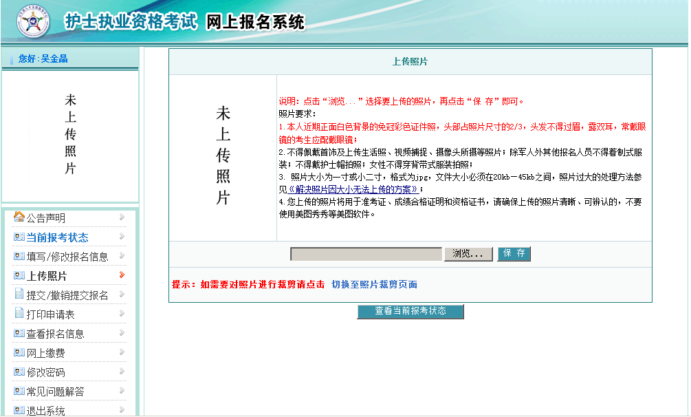 (2)上傳照片。按要求上傳近期彩色免冠寸照,要求正規(guī)照相館拍攝,圖像清晰,像素符合要求;不得采用手機(jī)自拍、生活照等相片,該照片除用于考試外,還直接用于護(hù)士執(zhí)業(yè)資格證書的制作,終身使用,請高度重視?。ㄕ埵孪炔榭磮竺到y(tǒng)中有關(guān)照片的要求)