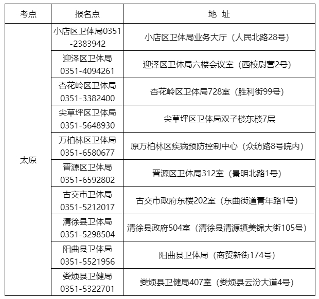 (一)太原考點(diǎn):太原市衛(wèi)生健康委員會(huì)(太原市住房公積金管理中心萬柏林分理處303室)