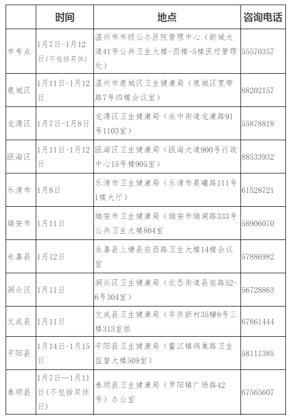 在溫省屬醫(yī)院、市屬醫(yī)療衛(wèi)生單位及市屬其他企事業(yè)單位報考人員由單位統(tǒng)一收集資料后到市考點報名確認(rèn);縣(市、區(qū))醫(yī)療衛(wèi)生單位和縣(市、區(qū))其他企事業(yè)單位報考人員到單位所在地的縣(市、區(qū))衛(wèi)生健康局報名確認(rèn)(具體時間、地點如下)。