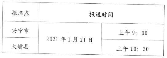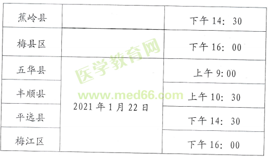 (二)現(xiàn)場確認(rèn)、紙質(zhì)材料報(bào)送時(shí)間:市直單位Ⅰ艮考人員由單位統(tǒng)一于2021年1月19日—20日將報(bào)考人員紙質(zhì)材料報(bào)送至梅州市醫(yī)藥科學(xué)研究所(梅州市梅江一路32號(hào))。各縣(市、區(qū))報(bào)考人員請(qǐng)到各縣報(bào)名點(diǎn)進(jìn)行現(xiàn)場確認(rèn)及提交紙質(zhì)材料。各共報(bào)名點(diǎn)的設(shè)置詳見《梅州考點(diǎn)報(bào)名點(diǎn)一覽表》(附件2),現(xiàn)場確認(rèn)時(shí)間安排由報(bào)名點(diǎn)根據(jù)實(shí)際自定并對(duì)外公布。各縣(市、區(qū))報(bào)名點(diǎn)報(bào)送紙質(zhì)材料至梅州市醫(yī)藥科學(xué)研究所時(shí)間安排如下: