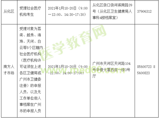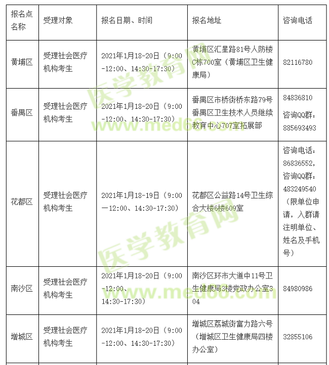 1.各區(qū)衛(wèi)健局報(bào)名點(diǎn):原則上受理屬下單位申報(bào)人員(單位含民營(yíng)社區(qū)衛(wèi)生服務(wù)中心,人員含在編和非在編人員)集體報(bào)名確認(rèn),各報(bào)名點(diǎn)可按實(shí)際情況選擇在2021年1月7-22日期間進(jìn)行現(xiàn)場(chǎng)確認(rèn)工作。花都、番禺、增城、從化、南沙、黃埔6個(gè)區(qū)衛(wèi)健局報(bào)名受理社會(huì)醫(yī)療機(jī)構(gòu)考生報(bào)名時(shí)間、地址及咨詢電話如下: