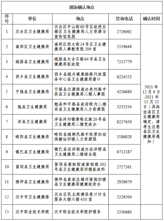 (二)資格初審及現(xiàn)場確認:2021年12月9-22日,資格初審及現(xiàn)場確認由各報名點(各縣區(qū)衛(wèi)生健康局、漢中職業(yè)技術(shù)學(xué)院)根據(jù)實際情況安排,全市共設(shè)13個報名點(見附件)進行現(xiàn)場確認,市衛(wèi)生健康委直管單位12月22日統(tǒng)一在市衛(wèi)生健康委進行現(xiàn)場確認,市衛(wèi)生健康委不接受越級或個人報名。