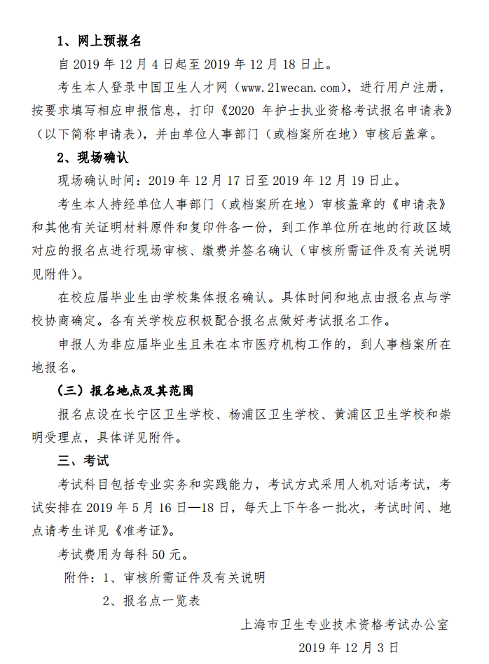 1、 網(wǎng)上預(yù)報(bào)名時(shí)間:2019年12月4日-12月18日期間,登錄中國(guó)衛(wèi)生人才網(wǎng)(www.21wecan.com)進(jìn)行網(wǎng)上預(yù)報(bào)名,根據(jù)報(bào)名須知在網(wǎng)上填寫個(gè)人報(bào)名信息,并從網(wǎng)上自行打印《2020年護(hù)士執(zhí)業(yè)資格考試報(bào)名申請(qǐng)表》。