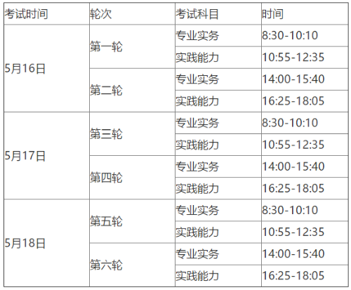 (二)考試時(shí)間:2020年5月16、17、18日三天,每半天為一個(gè)輪次,共分6輪次進(jìn)行??忌鷮㈦S機(jī)分配至其中一個(gè)輪次參加考試。具體安排如下:
