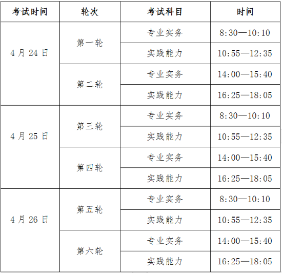 (四)考試形式及時間:2021年護士執(zhí)業(yè)資格考試實行人機對話考試,定于2021年4月24日—26日舉行,每半天為一個輪次,分為6輪次依次進行,考生將隨機分配至其中一個輪次,參加專業(yè)實務(wù)和實踐能力兩個科目的考試,具體安排如下: