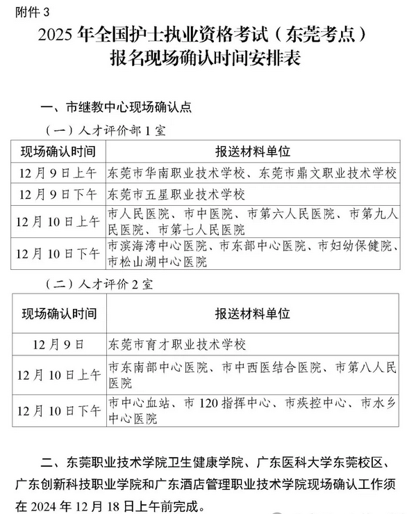 (1)市繼教中心設(shè)立2個現(xiàn)場確認點,負責受理局直屬各單位、東莞市南博職業(yè)技術(shù)學(xué)校、東莞市鼎文職業(yè)技術(shù)學(xué)校、東莞市育才職業(yè)技術(shù)學(xué)校、東莞市五星職業(yè)技術(shù)學(xué)校及東莞市華南職業(yè)技術(shù)學(xué)校提交的報名材料和現(xiàn)場確認。確認時間為2024年12月9日至10日09:00-12:00、14:30-17:30,地點為南城區(qū)三元路8號報業(yè)大廈附樓六樓,具體安排詳見附件3。