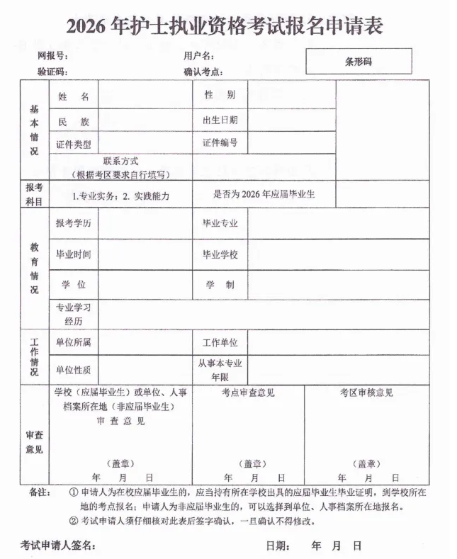 1.《2026年護(hù)士執(zhí)業(yè)資格考試報(bào)名申請(qǐng)表》(附件1),加蓋工作單位或檔案存放單位公章(2026年在校應(yīng)屆畢業(yè)生加蓋所在學(xué)校公章)。