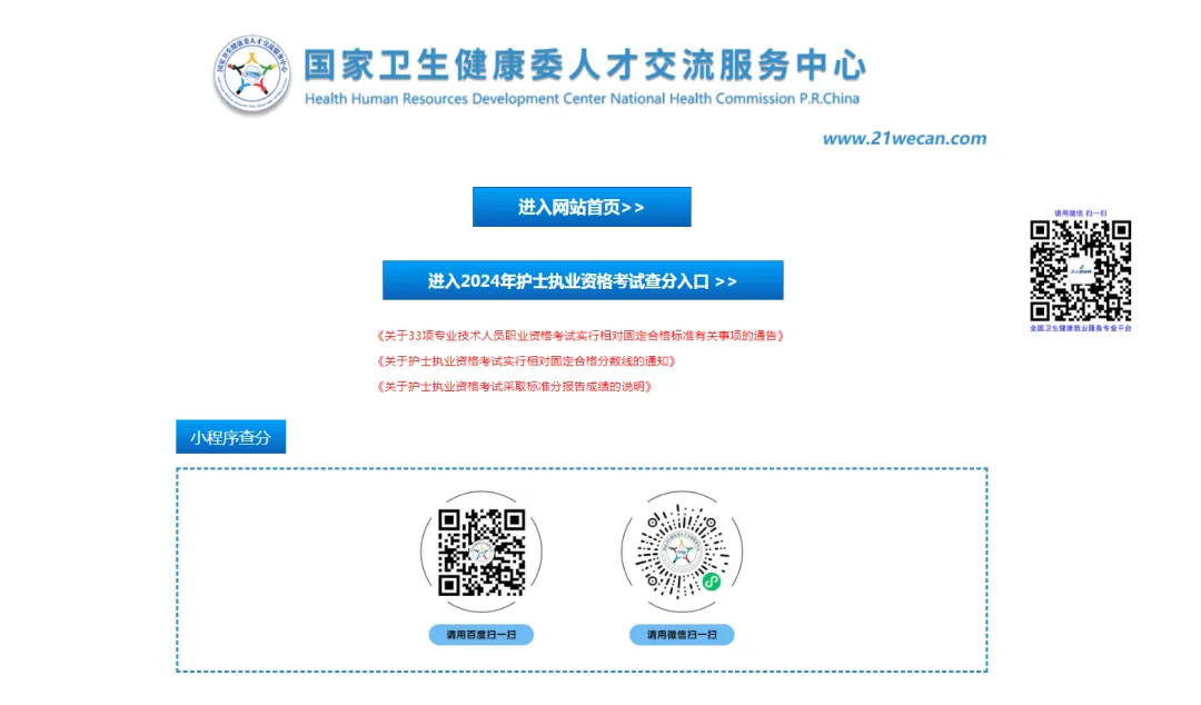 1.登錄國家衛(wèi)生健康委人才交流服務(wù)中心網(wǎng)站,點(diǎn)擊“進(jìn)入2024年護(hù)士執(zhí)業(yè)資格考試查分入口”。