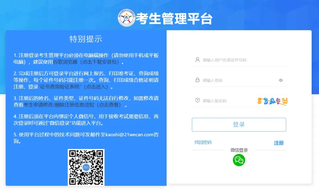 2.考生使用報(bào)名階段時(shí)注冊的用戶名、密碼,登錄考生管理平臺(tái);也可通過“微信登錄”功能,使用綁定的微信號掃碼登錄考生管理平臺(tái)。