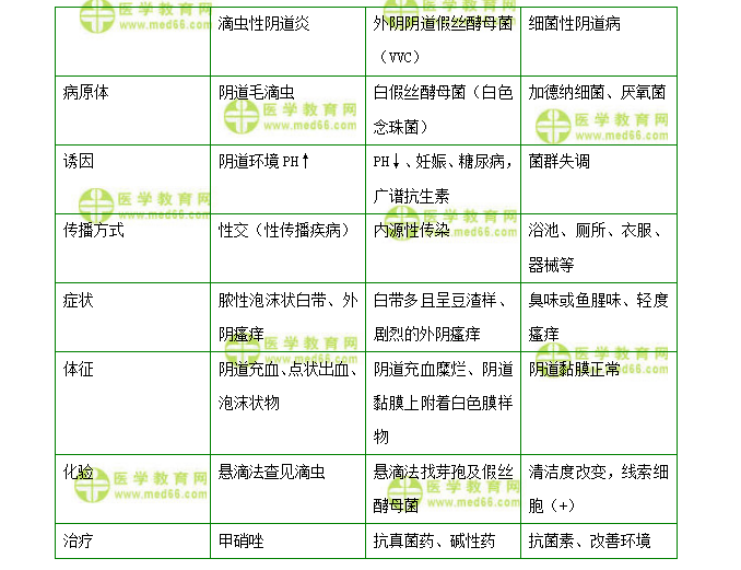 【解答】三種陰道炎的區(qū)別如下:【醫(yī)學教育網(wǎng)原創(chuàng)】