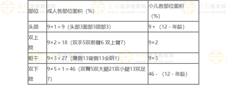 【解答】中國新九分法適用于較大面積燒傷的評估。該法將體表面積分為11個9%,另加會陰區(qū)的1%,構(gòu)成100%的體表面積。12歲以下小兒頭部面積較大,雙下肢面積相對較小,測算方法應(yīng)結(jié)合年齡進(jìn)行計(jì)算[醫(yī)學(xué) 教育網(wǎng)](見下表)。