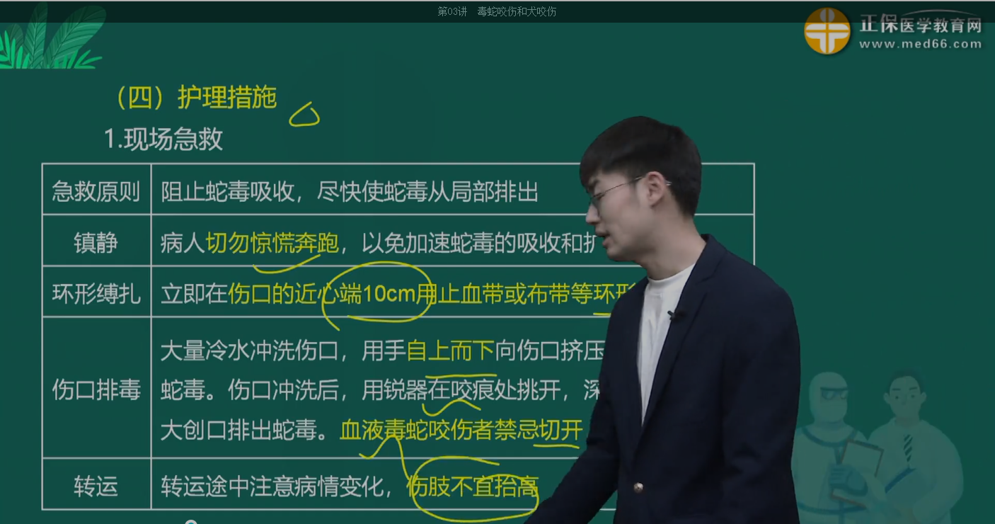 (1)鎮(zhèn)靜 病人切勿驚慌奔跑,以免加速蛇毒的吸收和擴散。