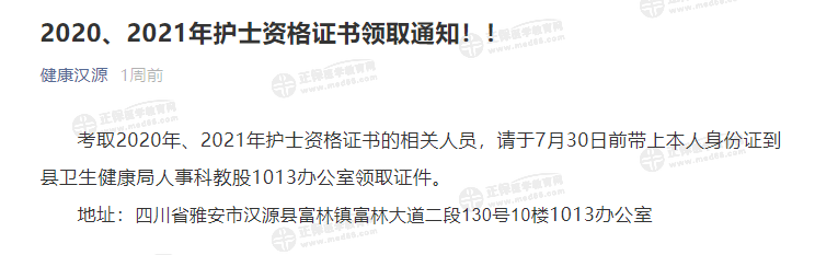 四川雅安漢源縣2020、2021年護(hù)士資格證書領(lǐng)取通知