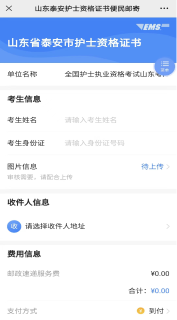 考生掃描下方二維碼,進(jìn)入郵寄信息填寫頁(yè)面,考生必須按照要求如實(shí)填寫本人姓名、身份證號(hào)、手機(jī)號(hào)碼、上傳手持身份證免冠照片(不要遮擋面部)進(jìn)行審核。