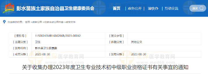 彭水苗族土家族自治縣衛(wèi)生健康委員會發(fā)布關(guān)于收集辦理2023年度衛(wèi)生專業(yè)技術(shù)初中級職業(yè)資格證書有關(guān)事宜的通知,醫(yī)學(xué)教育網(wǎng)整理具體內(nèi)容如下: