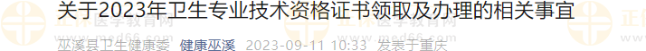 健康巫溪發(fā)布關(guān)于2023年衛(wèi)生專業(yè)技術(shù)資格證書領(lǐng)取及辦理的相關(guān)事宜,醫(yī)學(xué)教育網(wǎng)整理具體內(nèi)容如下: