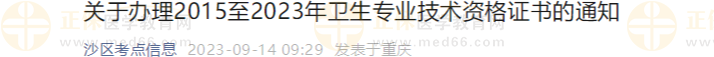 沙區(qū)考點信息發(fā)布關(guān)于辦理2015至2023年衛(wèi)生專業(yè)技術(shù)資格證書的通知,醫(yī)學(xué)教育網(wǎng)整理具體內(nèi)容如下: