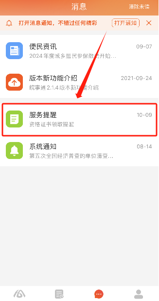 2.點(diǎn)擊消息,關(guān)注“服務(wù)提醒”,如下圖。