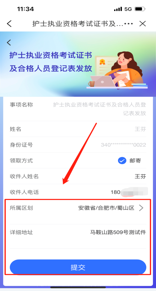 4.點(diǎn)擊“查看詳情”后,進(jìn)入證書(shū)申領(lǐng)發(fā)放環(huán)節(jié),按要求填寫證書(shū)收件地址,點(diǎn)擊“提交”按鈕,即可完成資格證書(shū)申領(lǐng)工作。后續(xù)由ESM快遞按照收件地址送達(dá)證書(shū),如下圖。