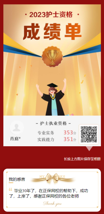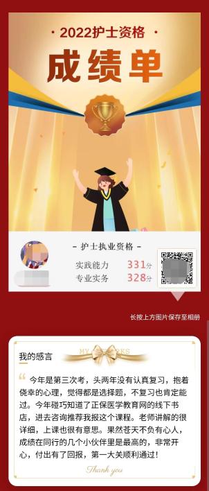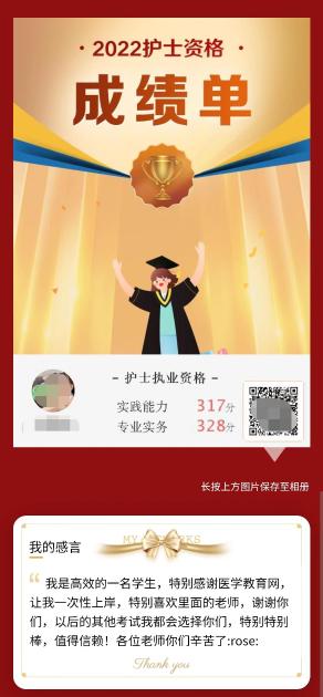 真的恭喜這位學(xué)員,能夠在醫(yī)學(xué)教育網(wǎng)老師的陪伴下,過五關(guān)斬六將,順利取證!小編也想對(duì)正在準(zhǔn)備參加護(hù)士資格考試的考生說,希望通過這位學(xué)員的分享可以讓大家更加信賴醫(yī)學(xué)教育網(wǎng)的老師,相信醫(yī)學(xué)教育網(wǎng)課程的品質(zhì)!去試聽課程>