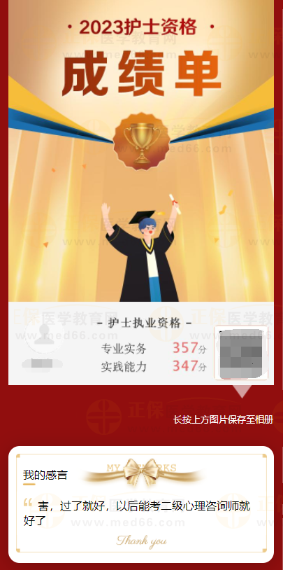 2023年護(hù)士資格考試成績已經(jīng)公布,有很多成功通過考試的考生都分享了自己的備考經(jīng)驗(yàn),醫(yī)學(xué)教育網(wǎng)為大家整理“#2023護(hù)士資格學(xué)員心聲#感謝醫(yī)學(xué)教育網(wǎng)各位老師,直擊考點(diǎn),押題準(zhǔn)確!”內(nèi)容如下,快來看看吧!