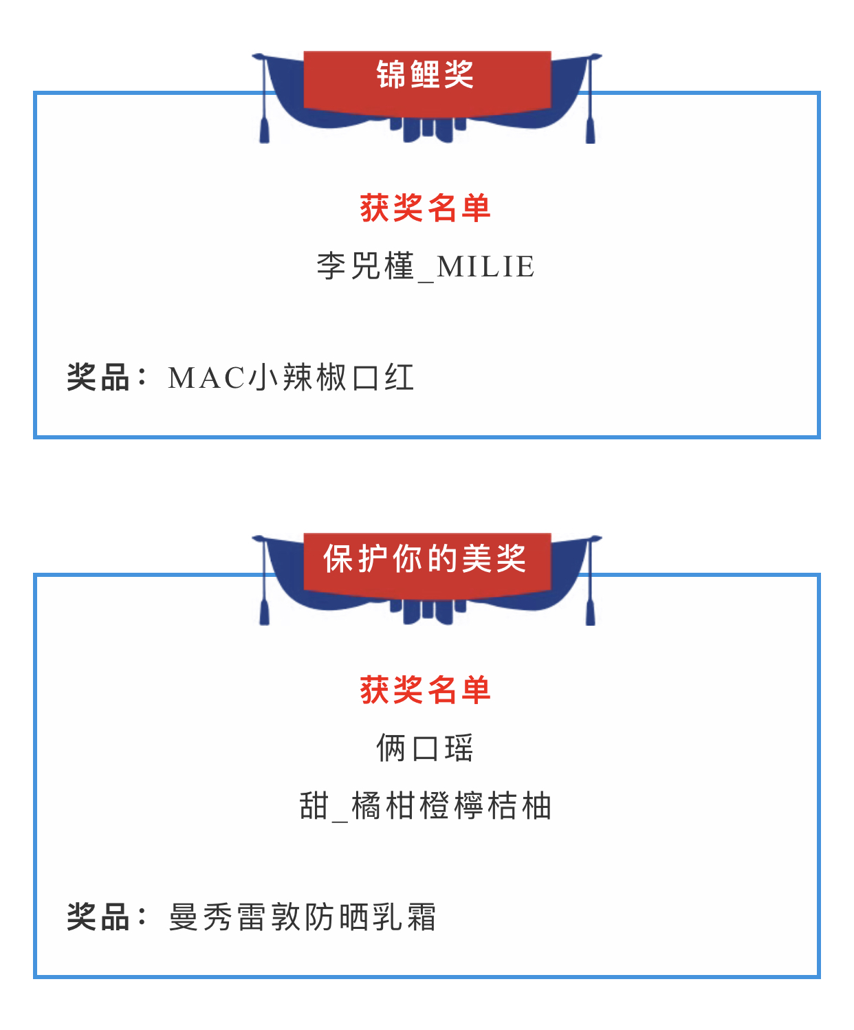 1.“MAC小辣椒口紅”和“曼秀雷敦防曬乳霜”的獲獎?wù)?,請盡快按照微博中獎提示填寫相關(guān)信息,我們將盡快給您郵寄獎品。