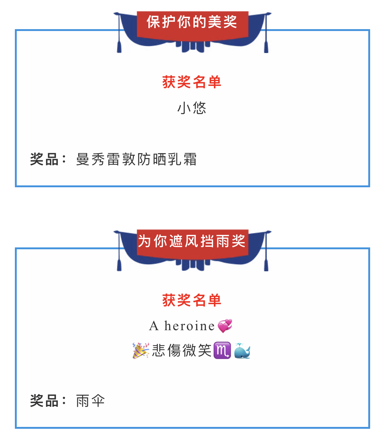 1.“曼秀雷敦防曬乳霜”和“雨傘”的獲獎?wù)?,請在后臺回復(fù)“姓名+手機(jī)號碼+收貨地址”,我們將盡快給您郵寄獎品。