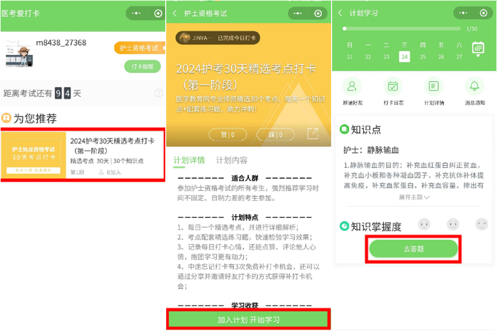 第三步:選擇打卡計劃,如“2024護考30天精選考點打卡(第一階段)”,點擊下方“加入計劃開始學(xué)習(xí)”,進入學(xué)習(xí)知識點并答題。