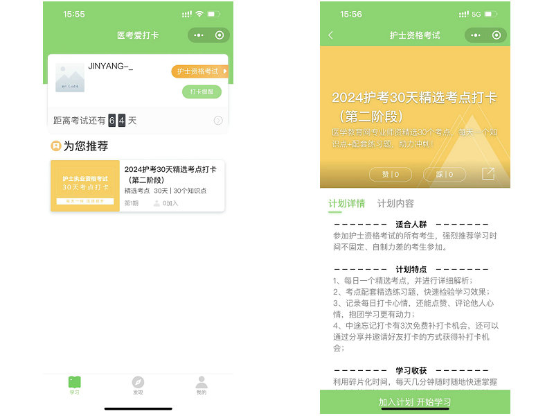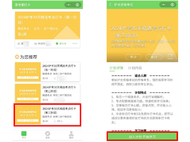 第三步:選擇打卡計(jì)劃,“2024護(hù)考30天精選考點(diǎn)打卡(第三階段)”,點(diǎn)擊下方“加入計(jì)劃開始學(xué)習(xí)”,進(jìn)入學(xué)習(xí)知識(shí)點(diǎn)并答題。