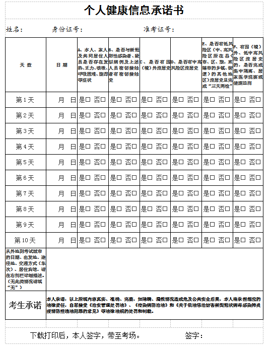 (六)考生須下載并按要求填寫《個人健康信息承諾書》(見附件),如實填報本人筆試前10天旅居情況和健康狀況??忌鷮€人健康狀況填報實行承諾制,承諾填報內(nèi)容真實、準確、完整,不得隱瞞、漏報、謊報旅居史、接觸史、健康狀況等疫情防控重點信息。