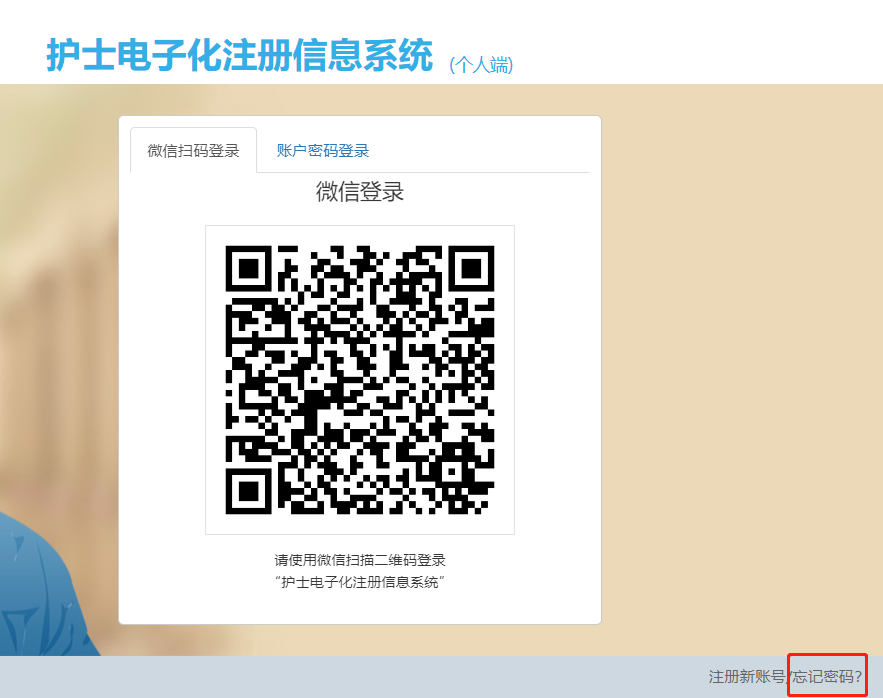 ①打開護(hù)士電子化注冊個人端登錄頁面,選擇“忘記密碼”。