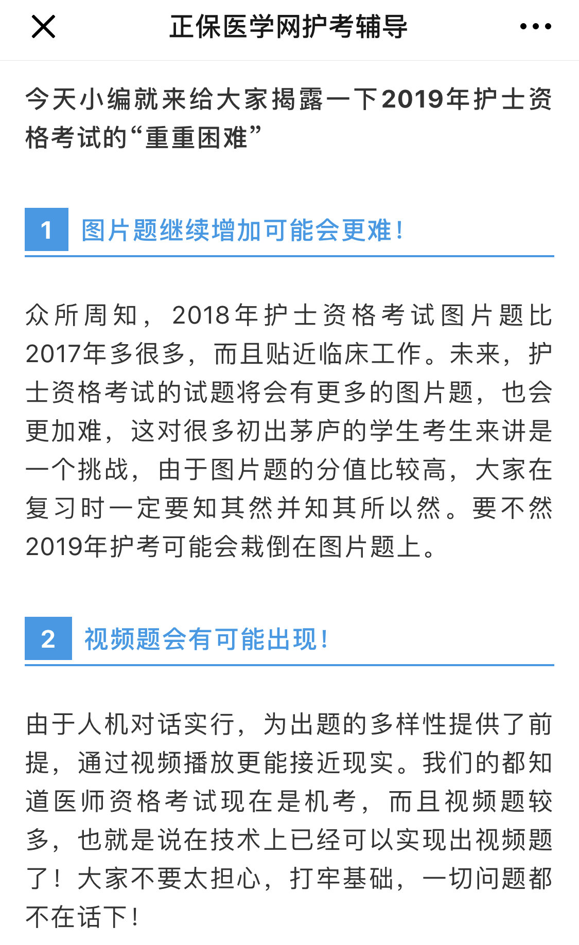關(guān)于視頻試題的增加,小編在之前的2019年護(hù)士資格考試趨勢(shì)中也分析過(guò),不知道各位考生有沒(méi)有做好復(fù)習(xí)準(zhǔn)備呢?