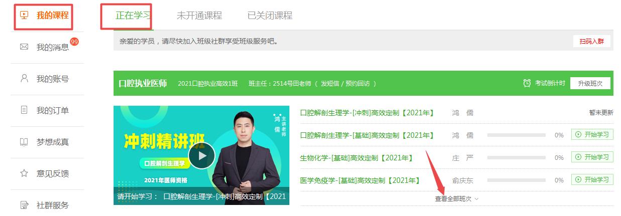 (一)電腦端:從醫(yī)學(xué)教育網(wǎng)首頁進(jìn)入“我的網(wǎng)校我的家”-“我的課程”-“查看更多班次”