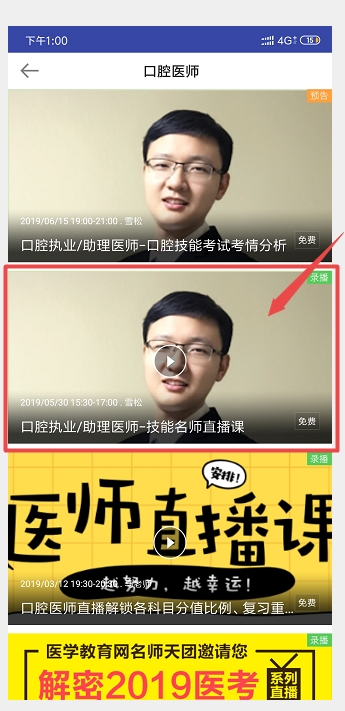 3、點(diǎn)擊下方“直播”-->“口腔醫(yī)師”-->“口腔醫(yī)師技能老師直播”。