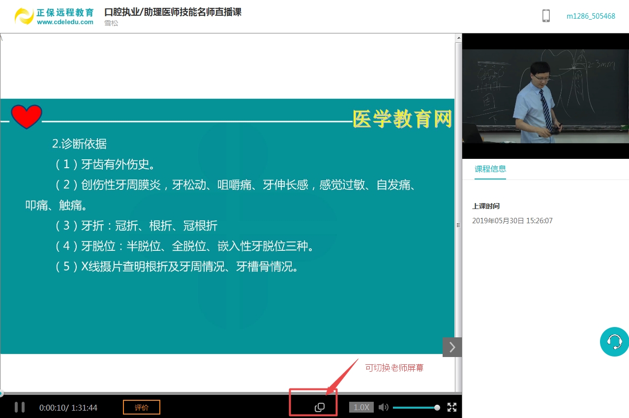 錄播默認(rèn)是講義頁面,點(diǎn)擊如下圖紅框所示按鈕,可切換老師屏幕