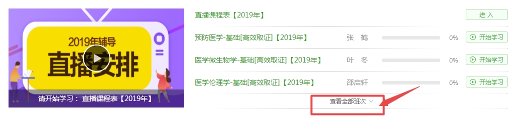 電腦端看課:從醫(yī)學(xué)教育網(wǎng)首頁進(jìn)入“我的網(wǎng)校我的家”-“我的課程”-“查看班次”-“教輔領(lǐng)讀”(示例如下)