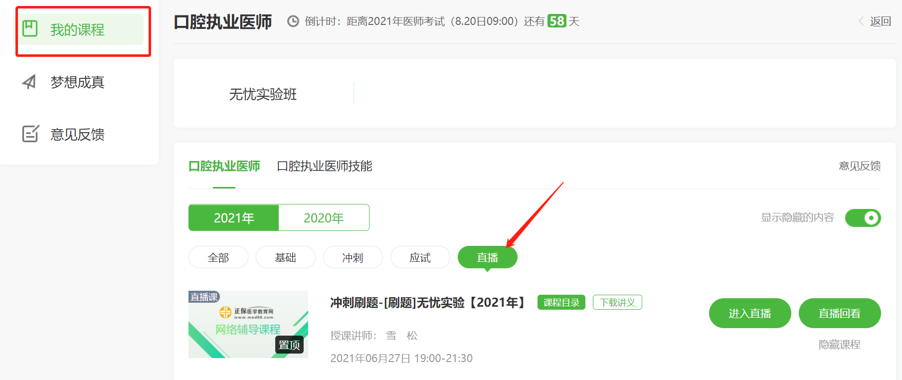 方法2:從醫(yī)學教育網(wǎng)首頁進入“我的網(wǎng)校我的家”-“我的課程”-“進入學習”-“直播”