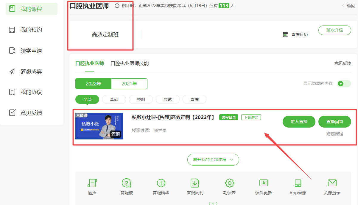 從醫(yī)學教育網(wǎng)首頁進入“我的網(wǎng)校我的家”-“我的課程”-“進入學習”-“直播”-私教小灶課,直播前開放直播入口;