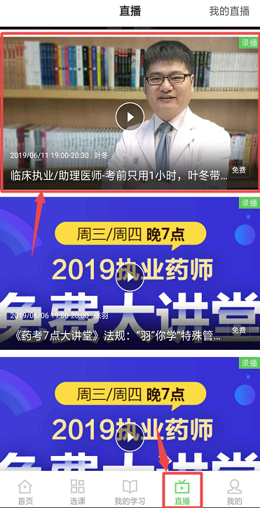 3、點擊下方“直播”-->進(jìn)入列表頁,找到臨床執(zhí)業(yè)/助理醫(yī)師技能老師直播課,點擊進(jìn)入后就可觀看課程。