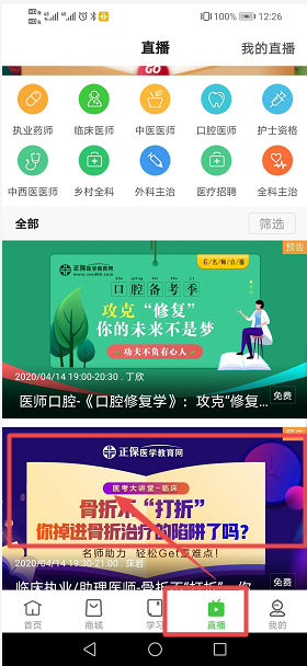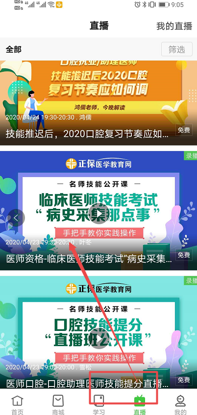 3、點(diǎn)擊底部直播進(jìn)入直播課程列表頁,找到對(duì)應(yīng)的直播進(jìn)入即可(舉例圖示如下)