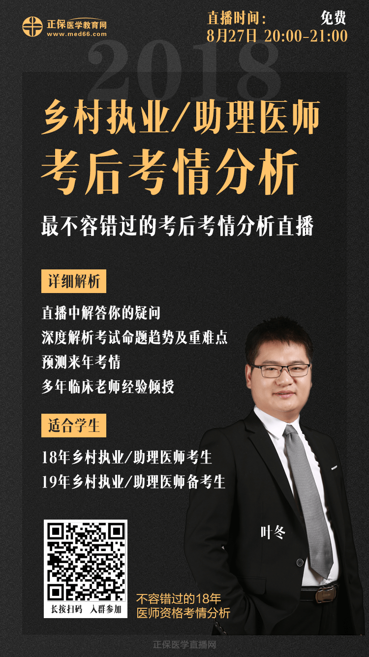 相信2018鄉(xiāng)村全科助理醫(yī)師筆試考后廣大考生都想知道今年的考情怎么樣?題難不難,題型跟往年一樣嗎?出題的方向更偏重哪方面?應(yīng)該是考生都比較關(guān)注的問題,8月27日葉冬將直播分析2018鄉(xiāng)村全科助理醫(yī)師筆試考情,屆時歡迎廣大考生觀看直播。