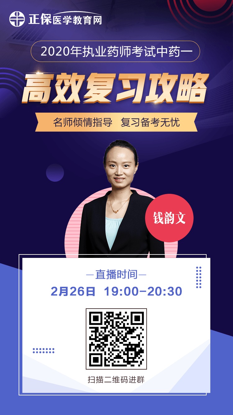 預(yù)告路漫漫其修遠兮,吾將上下而求索!2020年執(zhí)業(yè)藥師備考路途漫漫,醫(yī)學(xué)教育網(wǎng)陪大家一步一步走,2月26日 19:00-20:30錢韻文老師有 2020年執(zhí)業(yè)藥師考試中藥一高效復(fù)習(xí)攻略免費直播!備考必看!約起來!