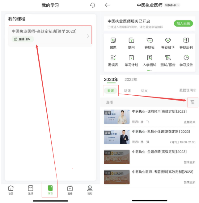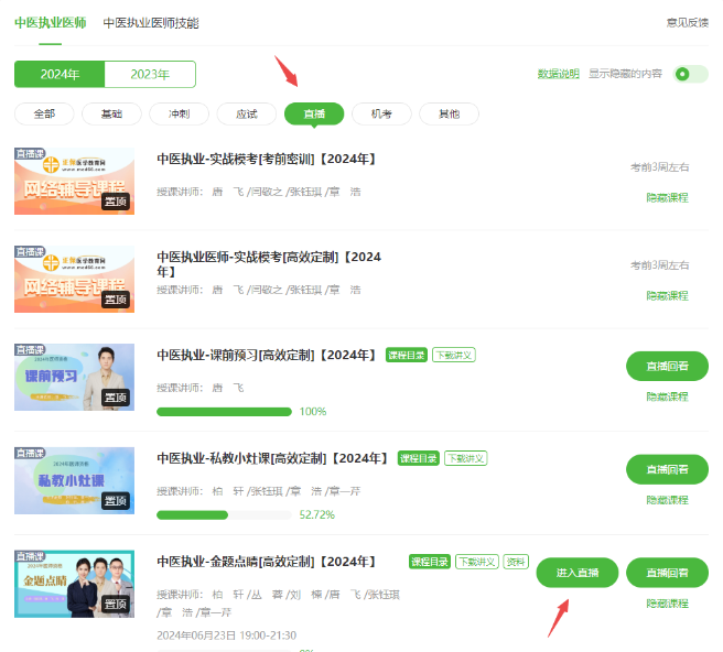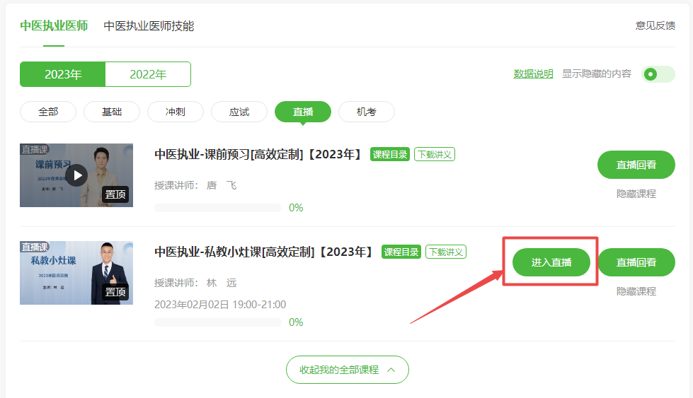 從醫(yī)學(xué)教育網(wǎng)首頁進(jìn)入“我的網(wǎng)校我的家”-“我的課程”-“進(jìn)入學(xué)習(xí)”-“直播”,直播已開放直播入口;