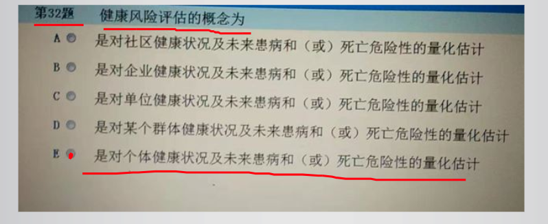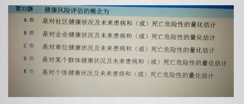 考試形式如下圖示意,這道選擇題“健康風(fēng)險(xiǎn)評(píng)估的概念”為單選,當(dāng)確認(rèn)好答案后選擇前面的按鈕即可,選擇后點(diǎn)擊下一步視為本道題答題結(jié)束,不可返回修改。