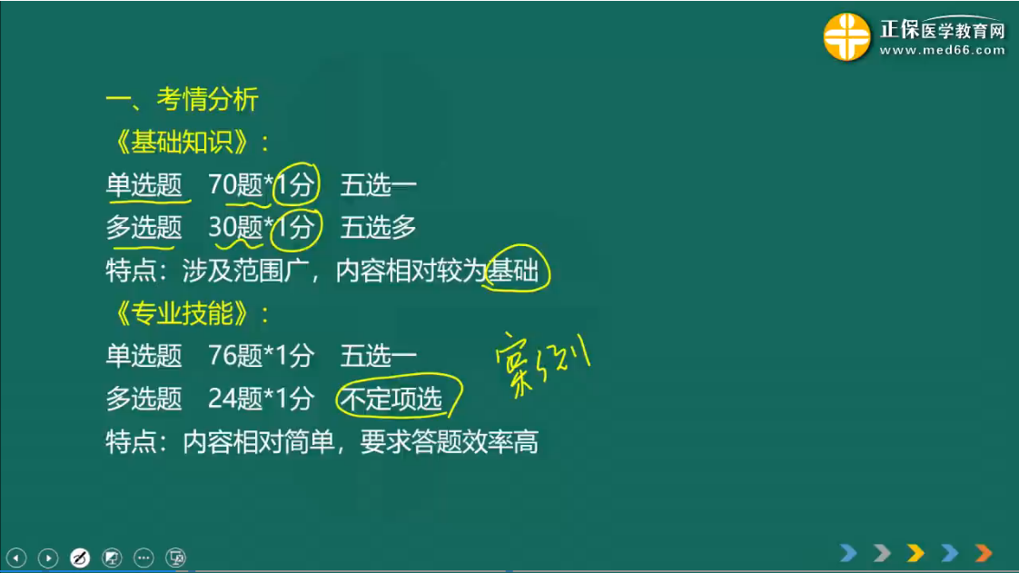 《專業(yè)技能》考試的特點(diǎn)為內(nèi)容相對(duì)簡(jiǎn)單,要求答題效率高。該科目試題往往會(huì)更結(jié)合實(shí)踐、案例的方式進(jìn)行考核,一個(gè)接一個(gè)案例的考核大家,案例通常會(huì)表達(dá)某個(gè)個(gè)體或群體的健康狀況、行為習(xí)慣、生理生化指標(biāo)然后請(qǐng)考生回答1到5個(gè)小題。這種題型要求考生不僅要夯實(shí)基礎(chǔ),還要仔細(xì)的閱讀案例,剖析案例中說出現(xiàn)的個(gè)體或群體具備哪些特點(diǎn)以及在案例中它與我們所學(xué)過的哪些知識(shí)相銜接,綜上通過本科目考生需要具備更詳細(xì)的分析能力同時(shí)要做到觸類旁通和舉一反三。雖然《專業(yè)技能》考試對(duì)考生提出了相對(duì)更高的要求,但是歷年來考生的通過率也很高,只要考生能夠夯實(shí)基礎(chǔ)同時(shí)在考前復(fù)習(xí)中提高答題策略和技巧,那么通過考試不成問題!