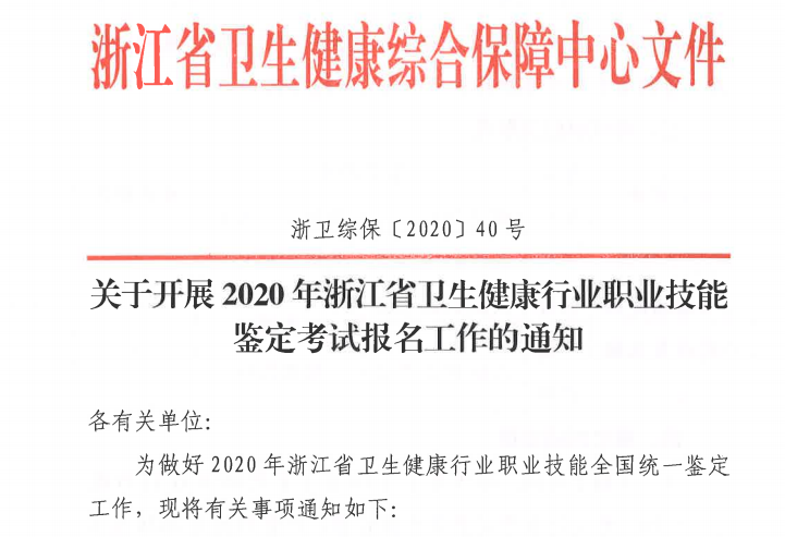 日前,浙江省衛(wèi)生計生人才網(wǎng)發(fā)布關(guān)于開展2020年浙江省衛(wèi)生健康行業(yè)職業(yè)技能鑒定考試報名工作的通知(浙衛(wèi)綜保〔2020〕40號),具體內(nèi)容如下:
