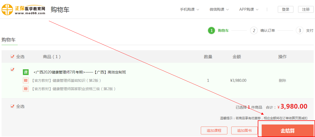 第二步:在購(gòu)物車內(nèi)確認(rèn)已選課程,確認(rèn)無(wú)誤后點(diǎn)擊“去結(jié)算”;第三步:在訂單頁(yè)確認(rèn)無(wú)誤后,點(diǎn)擊“提交訂單”;